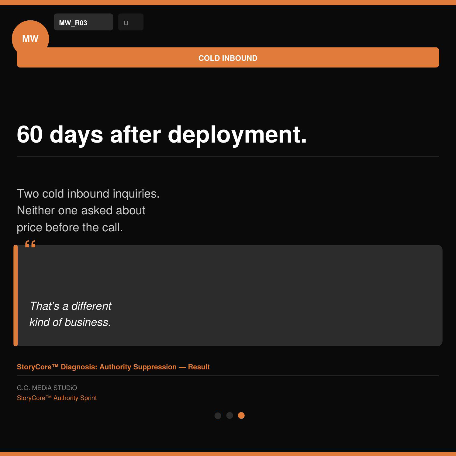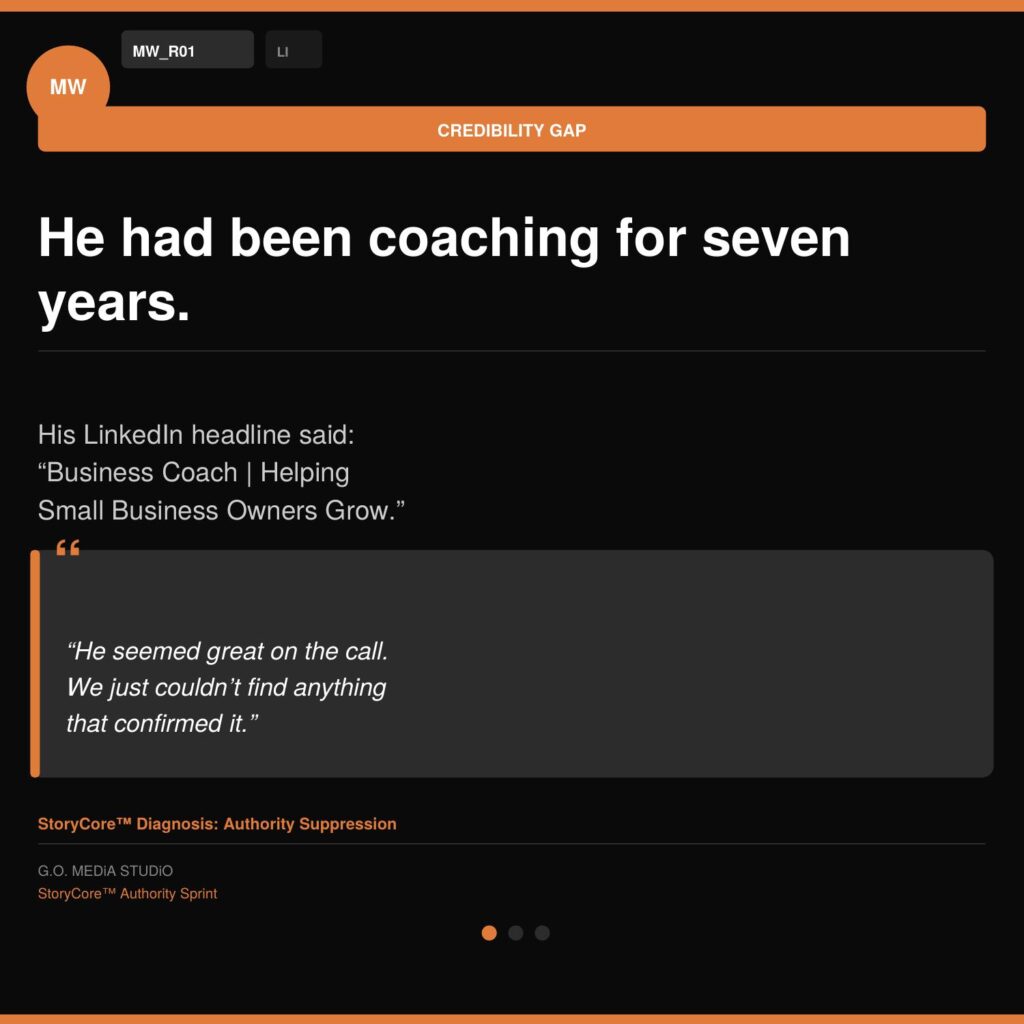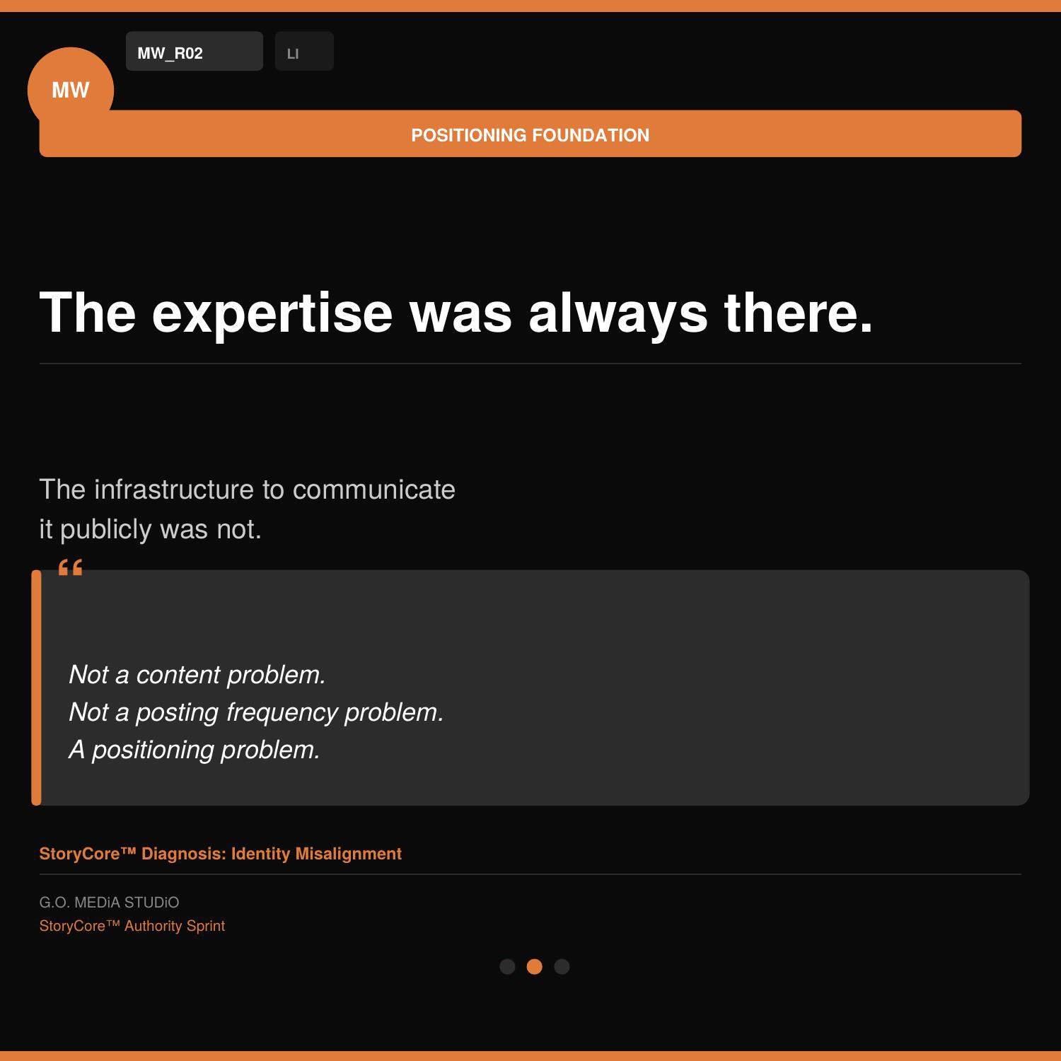 | G.O. Media Studio is an authority positioning studio. We work with established consultants, coaches, and professional service founders who are done losing deals to people with louder profiles. Through StoryCore™, we close the gap between what you’ve built and what the market can see. |